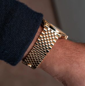 The seven links of the Settimo bracelet are all polished and slightly contoured to wear comfortably on the wrist. The bracelet reflects and plays with the light wonderfully when you see it in person, and I have a feeling there are going to be a lot of people deciding to pull the trigger on one of these once they experience it in the metal. It’s totally solid and feels tough while being delicate enough to almost drape around the wrist. Some people took issue with the fact that the end-links don’t sit completely flush with the case, but personally, I don’t want that integrated look on the dress perfect fake watches UK. The Land-Dweller’s new “integrated Flat Jubilee” bracelet works with its more hybrid style, but when it comes to a pure dress watch, I actually prefer how the Settimo is executed.
